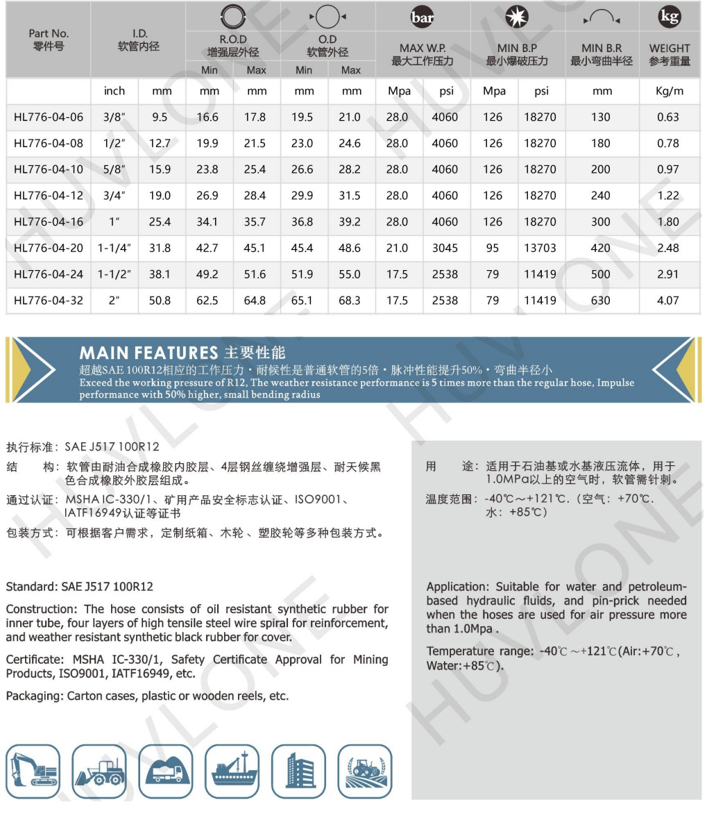 符合/超越SAEJ517100R12四層鋼絲纏繞橡膠軟管