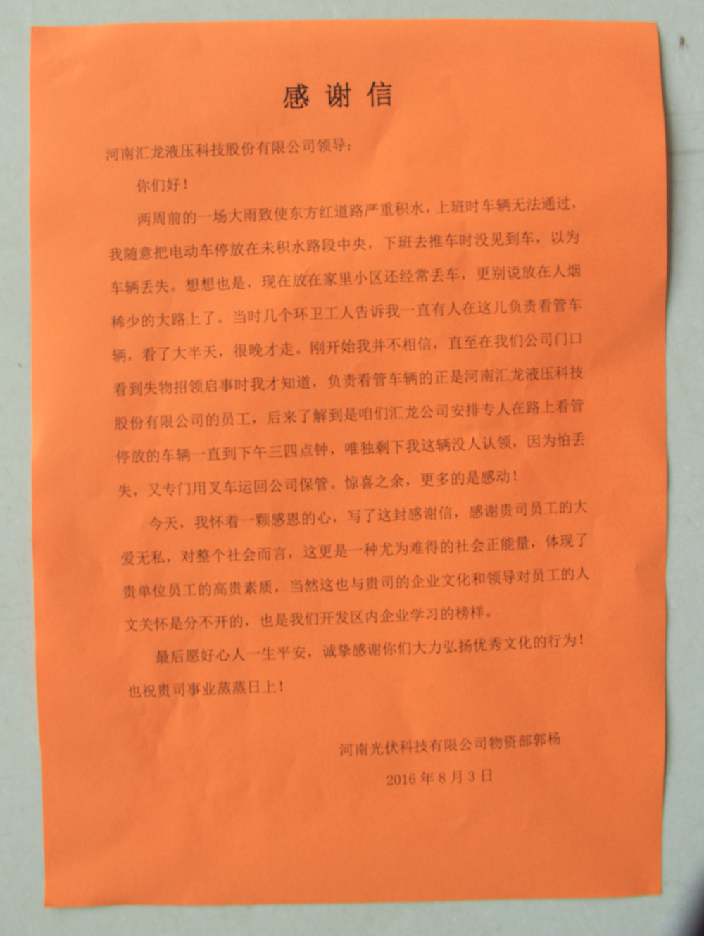 8月2日,協(xié)鑫的兩名員工來到我公司認(rèn)領(lǐng)電動(dòng)車,電動(dòng)車主人為協(xié)鑫物資部郭楊,郭楊說,她幾乎已經(jīng)放棄了尋找電動(dòng)車的希望,并把電動(dòng)車防盜鎖的鑰匙都給扔了。8月3日上午,我公司設(shè)備部員工幫忙將電動(dòng)車的鎖打開,郭楊高高興興地推走了電動(dòng)車。下午,郭楊又同協(xié)鑫行政部、供應(yīng)部、采購(gòu)部的幾名人員前來我公司進(jìn)行感謝,并帶來了一封感謝信。