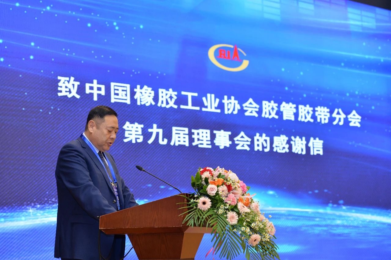 膠管膠帶分會副理事長、青島橡六輸送帶有限公司董事長王立憲代表分會新一屆理事會宣讀了《致膠管膠帶分會第九屆理事會的感謝信》。