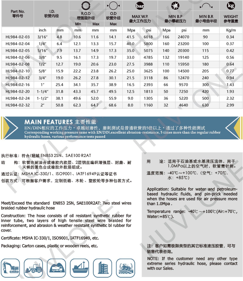 Meet/Exceed the standard EN853 2SN/SAE100R2AT: Two steel wires braided rubber hydraulic hose with abrasion-resistance